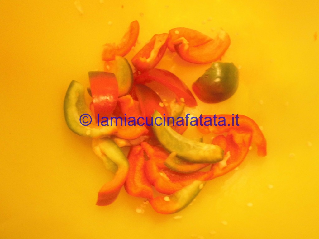 Lavare per bene i peperoni,spuntare,toglier i semi e i filamenti interni e tagliarli a filetti