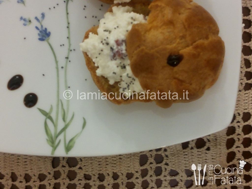 Io ho fatto i bigne’ con la ricetta delle zeppole al farro che ho pubblicato qualche giorno fa ,ma potete usare anche i bigne’ già pronti che si vendono in panetteria o al super,quelli rustici li ho farciti con una crema di ricotta a cui ho aggiunto primosale ,provola passati nel frullatore e salsiccia dolce tagliata finemente e amalgamato il tutto con un po’ di panna liquida e noce moscata ,riempiti i bignè e messi in frigo ,al momento di servire ,decorare con semi di papavero e gocce di crema di aceto balsamico.