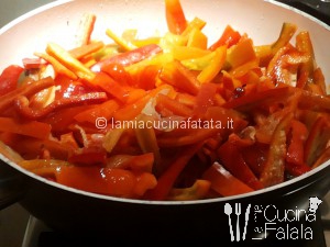 Prendere i peperoni,lavare,tagliare a filettie asgiugare su un canovaccio pulito.Intanto in un tegame mettere olio e stufare una bella cipolla grande ,possibilmente fresca,e farla appassire aggiungere i peperoni e cuocere prima scoperti e poi con il coperchio per un quindici fino a che sono appassiti e diventati morbidi.