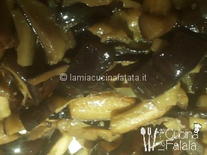 Intanto in un altro tegame ,cuocere le melenzane tagliate precedemente a filetti e messe a spurgare in una colapasta con un po’ di sale,poi strizzarle e farle cuocere con olio evo fino ad arrivare a cottura.