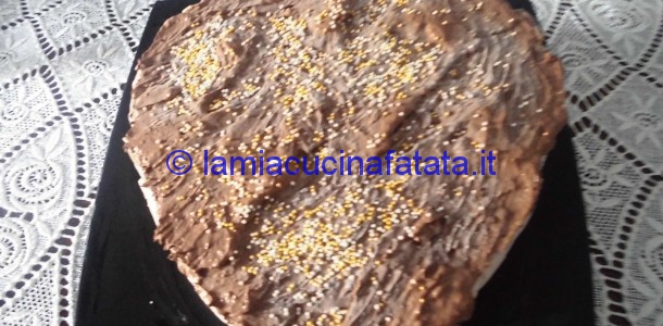 Tritare biscotti e fette biscottate con il burro in un mixer e ridurli molto finemente, foderare uno stampo a cuore con carta stagnola o carta forno bagnata e pressare il trito di biscotti per bene e metterlo in frigo .Intanto lavorare la ricotta con il fruttosio e unire lo yogurt e la panna montata.tritare il torrone e la cioccolata nel mixer e unire al composto in modo omogeneo,mettere nel frattempo i fogli di gelatina in acqua fredda per una decina di minuti.Scaldare due cucchiai di panna in un pentolino e aggiungervi i fogli di gelatina e successivamente unire al composto preparato.Quando è ben amalgamato versare nello stampo a cuore ,coprire con carta stagnola e mettere in frigo per tutta la notte,al mattino preparare il topping con 2 cucchiai di cacao amaro in polvere e 2 cucchiai di panna liquida e 1 cucchiaio di fruttosio . Togliere il dolce dallo stampo ,metterlo su un piatto di portata ,fare il topping e decorare con granella di nocciola o confettini dorati.